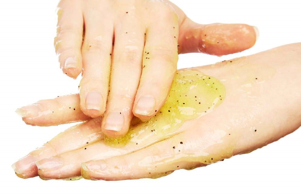 Use an exfoliator on your hands and wrists to eliminate dead skin and help make your hands look younger. There are many versions on the market but you can always make your own with a couple of spoons of sugar (brown sugar is gentler) and a bit of olive oil. After you exfoliate, use the orange stick to gently clean away any dirt under your nails and wash your hands. A lot of tutorials will tell you to moisturize at this point, but if you do, you’ll have a layer of oil on your nails that will make applying the polish difficult. Wait and put moisture on your hands when the manicure is finished and the polish is dry.