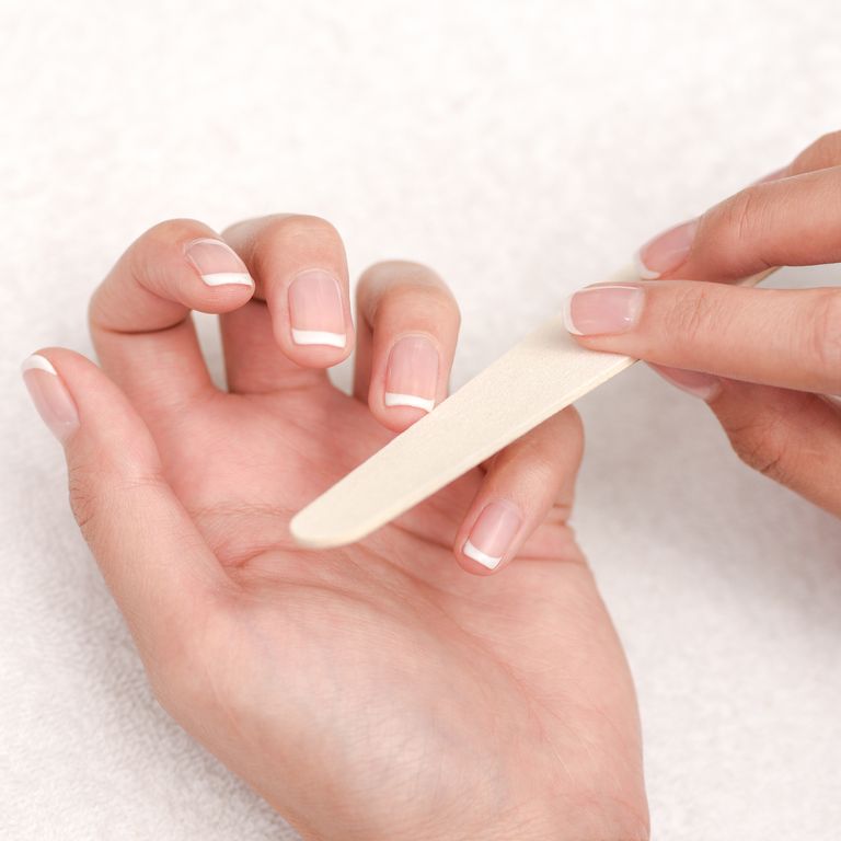 Clip your nails if they’re too long and then gently file them into shape. Try to use a one-way motion rather than filing both ways which will fray your nails. Avoid metal or extremely coarse nail files and choose an emery board which is gentler on your nails than other filing boards. Smooth the tops and sides of the nails with a buffer to ensure an even surface, Soaking the cuticle before trimming is crucial, but over-soaking actually damages skin and nails, so limit this step to three minutes or less.